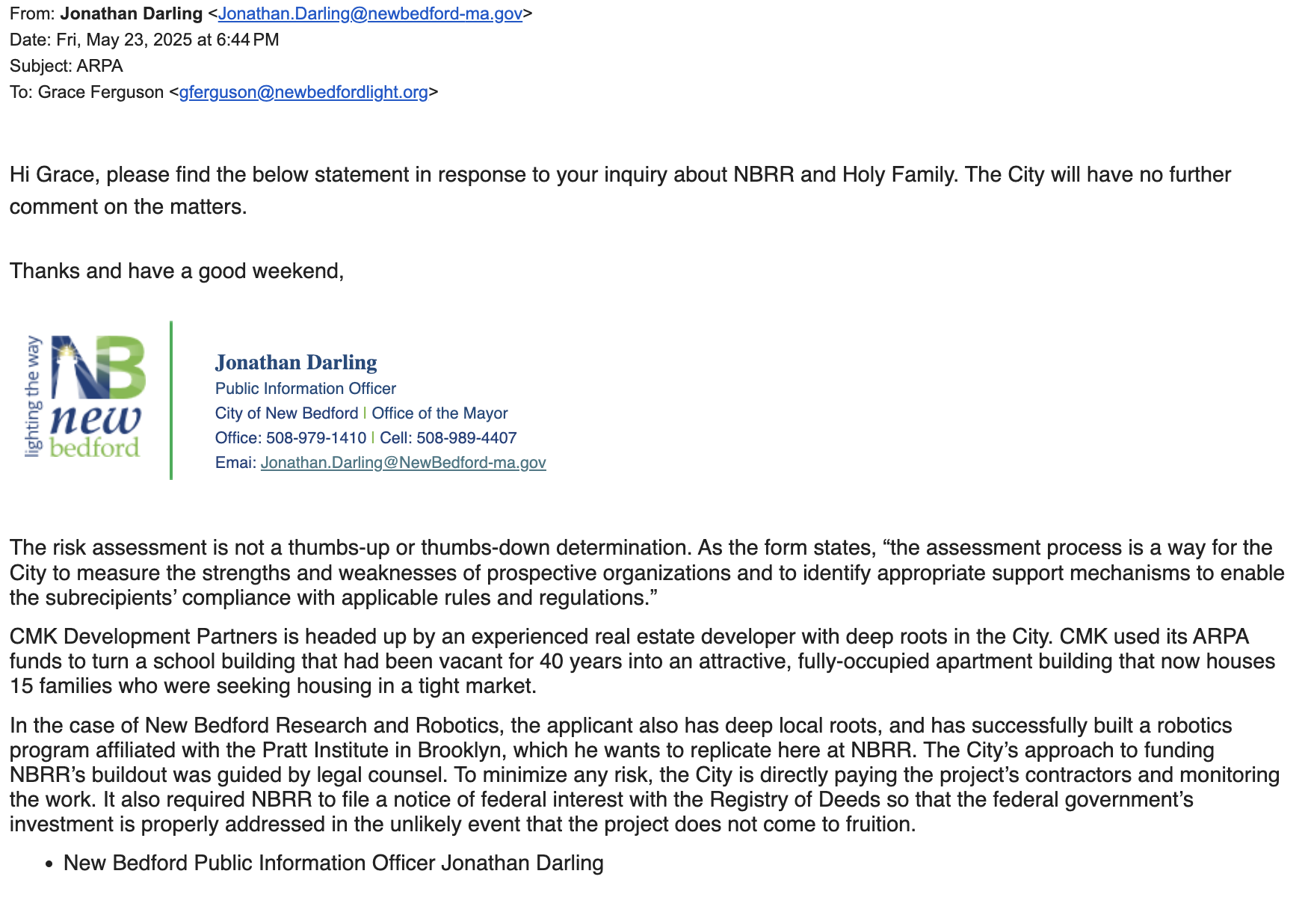 The applicant is the nonprofit New Bedford Research & Robotics. Mark Parsons, its founder and executive director, said he didn’t know that the city had determined that the grant was risky.